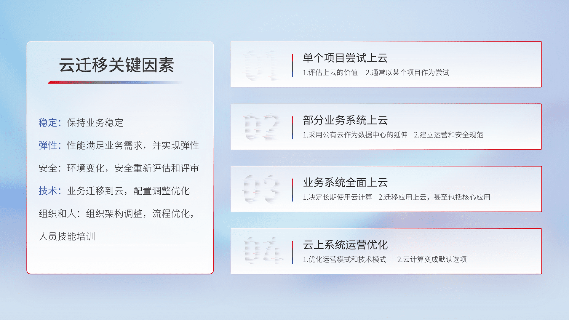 结合实际业务,,,从规划设计、、云平台选型、、、、云原生改造、、、、数据迁移、、、、集成交付,,,迁移全过程为客户识别最佳上云路径,,做好风险识别管理,,,,设计网络架构、、、、身份权限、、安全审计合规、、操作审计、、、、日志审计、、监控告警策略、、、多站点容灾设计等,,对云上基础设施进行整体规划,,,提升IT治理水平,,,以满足弹性、、、高可用、、、、高性能的需求。。。。